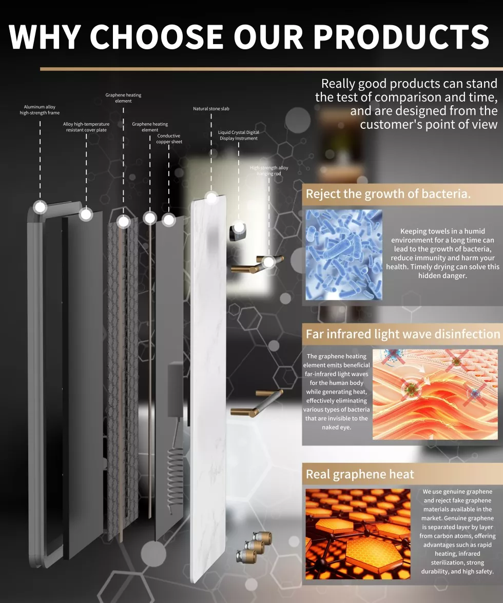 Black Graphene Rock Towel Rack သည်လက်သုတ်ပုဝါသည်လက်သုတ်ပုဝါများလျင်မြန်စွာခြောက်သွေ့စေပြီးခြောက်သွေ့မှုကိုထိန်းသိမ်းခြင်း, အပူစွမ်းအင်ကိုလွှဲပြောင်းရန်အတွက် 4-16 μမီတာလထွင်းသောဓါတ်ရောင်ခြည်ဓါတ်ရောင်ခြည်ကိုအသုံးပြုခြင်းအားဖြင့်၎င်းသည် staphylococcus areureus ကဲ့သို့သောအန္တရာယ်ရှိသောဘက်တီးရီးယားများ၏သတ်ဖြတ်မှုသည် 95% ရှိပြီး Mite ဖယ်ရှားရေးအကျိုးသက်ရောက်မှုမှာ 100%,